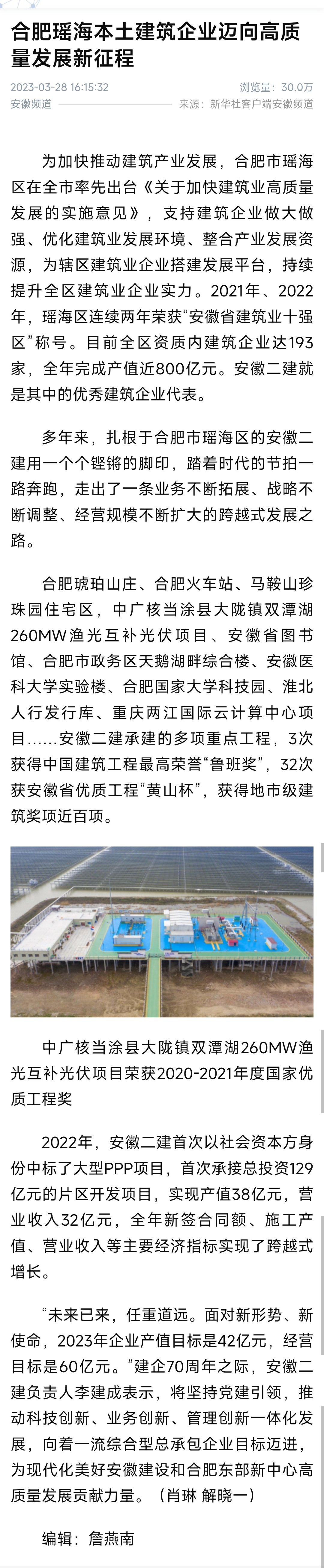 時(shí)光向前,二建向上!3月28日,自人民網(wǎng)、央廣網(wǎng)、中國網(wǎng)、中國日?qǐng)?bào)網(wǎng)、安徽日?qǐng)?bào)客戶端等主流媒體集中報(bào)道安徽二建七十年發(fā)展成就后,公司作為合肥瑤海本土優(yōu)秀建筑企業(yè)邁向高質(zhì)量發(fā)展新征程,首次刊登在新華社客戶端安徽頻道,一經(jīng)報(bào)道瀏覽量達(dá)30萬次。