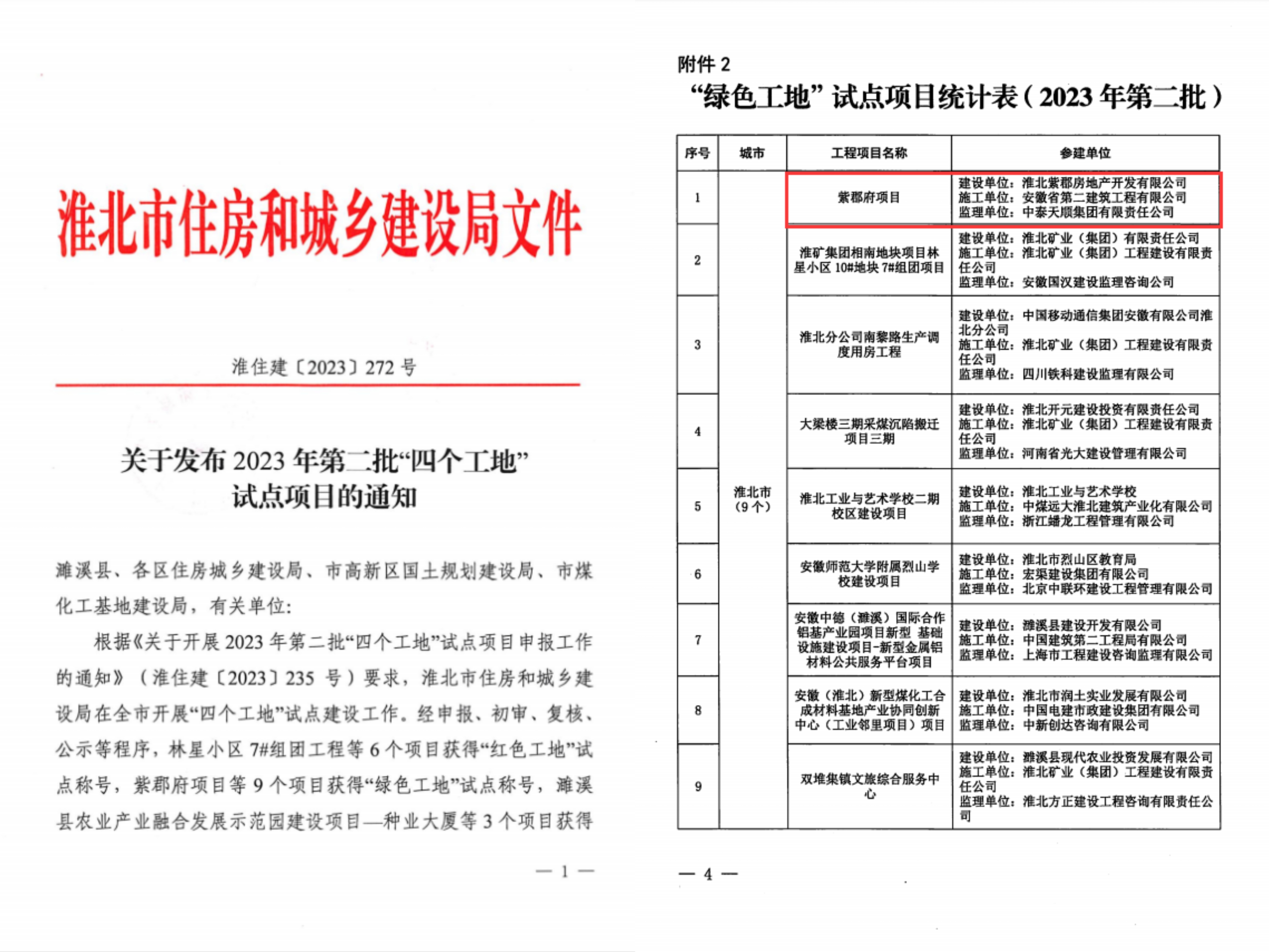 近日,淮北市住房和城鄉(xiāng)建設(shè)局發(fā)布了2023年第二批“四個(gè)工地”試點(diǎn)項(xiàng)目名單,建工二建第一公司承建的紫郡府項(xiàng)目榮獲淮北市第二批“綠色工地”試點(diǎn)項(xiàng)目稱號(hào)。