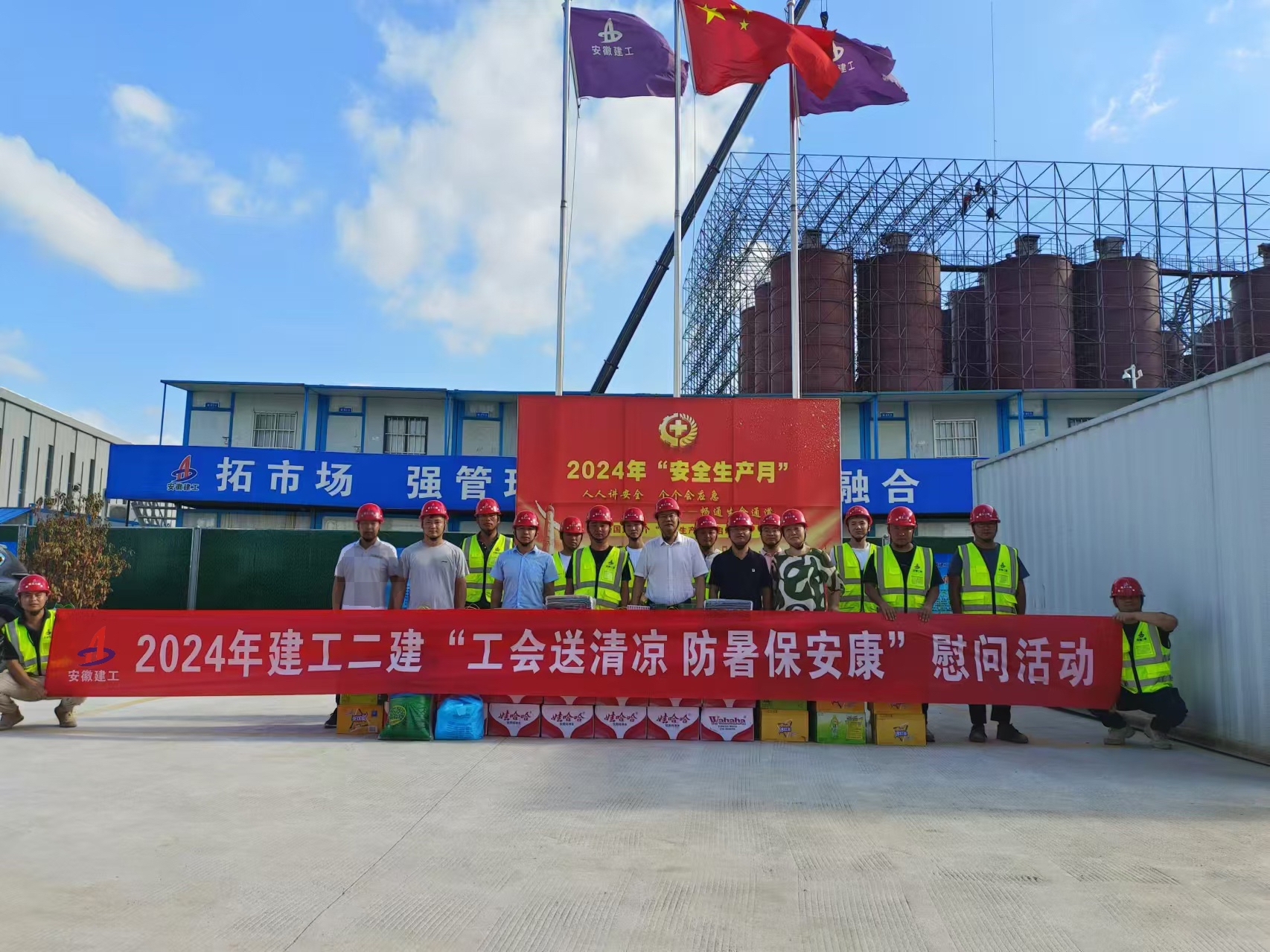 驕陽似火,酷暑難耐,為做好職工防暑降溫工作,有效防控高溫中暑事件和安全生產(chǎn)事故的發(fā)生,切實維護廣大職工的勞動安全和健康,7月25日,建工二建黨委副書記、總經(jīng)理陶良敬赴安徽建工(蕪湖)新材料智能智造產(chǎn)業(yè)園項目開展送清涼慰問活動。建工建材蚌埠建材公司副經(jīng)理邵亞飛參加慰問活動。