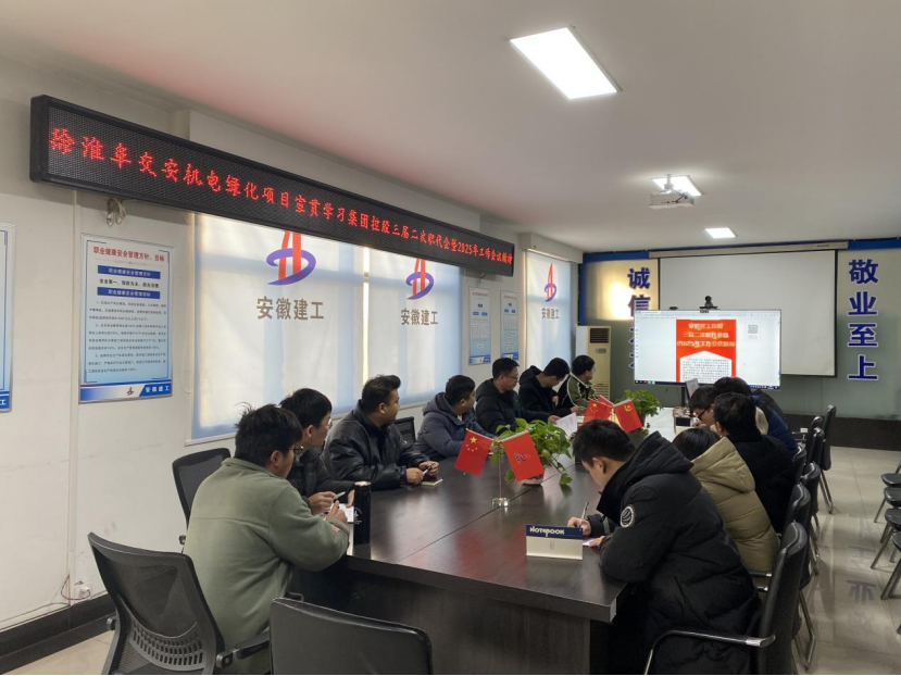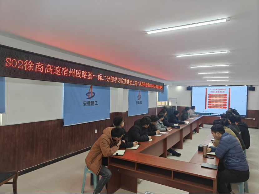 近日 ,安徽建工建設(shè)投資發(fā)展有限公司組織徐淮阜交安機電綠化項目部和S02徐商高速宿州段一標二分部項目學(xué)習(xí)宣貫集團三屆二次職代會暨2025年工作會議精神,確保會議精神在項目一線落地生根。