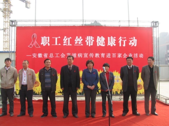 2010年11月24日上午,第23個“世界艾滋病日”即將來臨之際,由安徽省總工會、省建工集團開展的“職工紅絲帶健康防艾宣傳進百家企業(yè)活動”在省二建天下錦城二期項目部舉行啟動儀式,省總工會廳級巡視員、省女職工委主任牛和桂,省建工集團工會副主席李鵬飛,工會女職工委主任胡愛紅,省二建黨委書記朱治淮、工會主席李林等出席了啟動儀式。該項目部百余農(nóng)民工表示,今后要積極主動地加入到預防和控制艾滋病的行動中來,為遏制艾滋病在我省流行蔓延盡到應有的貢獻。