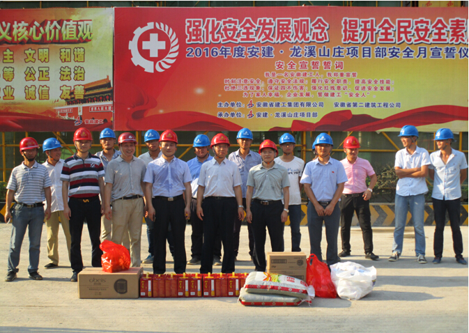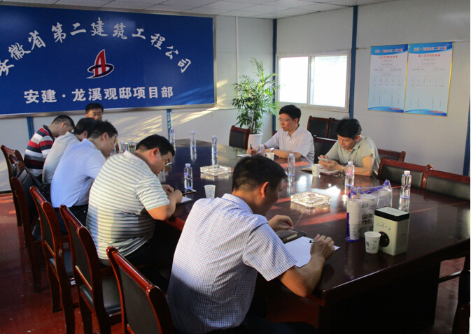 在隨后召開的現(xiàn)場工作會上,王厚良副總經(jīng)理對安建·龍溪山莊工程質(zhì)量和目前所取得的成績給予了充分肯定,對項目近期工作提出四點要求,一是要高標準、嚴要求,抓好現(xiàn)場安全文明施工和標準化施工,提高安徽建工集團在當?shù)氐挠绊懥?;二是要高度重視安全質(zhì)量,確保安全無事故,質(zhì)量無缺陷;三是要強化目標責任制,充分調(diào)動全體員工的積極性;四是要加強人才培養(yǎng),對青年人,工作上要交真本領,業(yè)務上要經(jīng)常開展技能培訓。