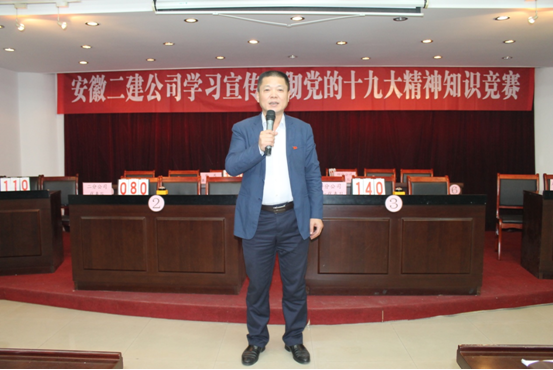 11月7日下午,安徽二建公司在原辦公樓三樓會議室舉辦了“學習宣傳貫徹黨的十九大精神知識競賽”活動。來自所屬各黨支部共計11支代表隊參加了此次比賽。公司黨委書記劉賢奇、總工程師邱立龍應邀出席會議,工會主席李林、紀委書記仇多維、女工部主任王俊共同擔任本次知識競賽活動的評委。公司機關(guān)各部門負責人,黨群部門全體人員,分公司黨政主要負責人、團支部書記觀看比賽。