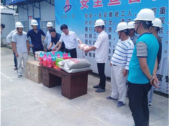 7月21日上午,驕陽似火,酷暑難當(dāng),集團公司工會副主席吳曉伍在公司工會主席李林的陪同下,不畏酷暑來到岳西潤業(yè)電商產(chǎn)業(yè)園開展“送清涼”活動,為奮戰(zhàn)在一線的員工和廣大農(nóng)民工送去了絲絲涼意,獻(xiàn)上了一份誠摯的關(guān)懷。項目經(jīng)理季風(fēng)帶領(lǐng)項目部全體成員迎接集團和公司領(lǐng)導(dǎo)并領(lǐng)取了集團公司為職工發(fā)放的防暑藥品、礦泉水、綠豆、毛巾、洗衣液等防暑降溫物品。