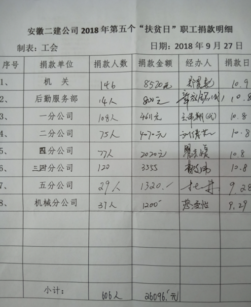 開展全國(guó)扶貧日捐款活動(dòng)距今已是第五個(gè)年頭,它體現(xiàn)了黨中央、國(guó)務(wù)院對(duì)扶貧開發(fā)工作的高度重視和對(duì)貧困地區(qū)群眾的關(guān)愛。工會(huì)每年?duì)款^組織此項(xiàng)活動(dòng),公司領(lǐng)導(dǎo)率先垂范、帶頭捐款,廣大職工積極響應(yīng),機(jī)關(guān)、分公司、項(xiàng)目部、一線班組員工紛紛奉獻(xiàn)自己的一份愛心。短短幾日,全公司上下共有606名職工參與,累計(jì)捐款26096元。