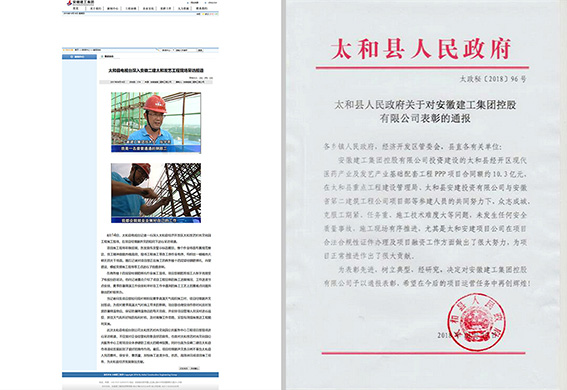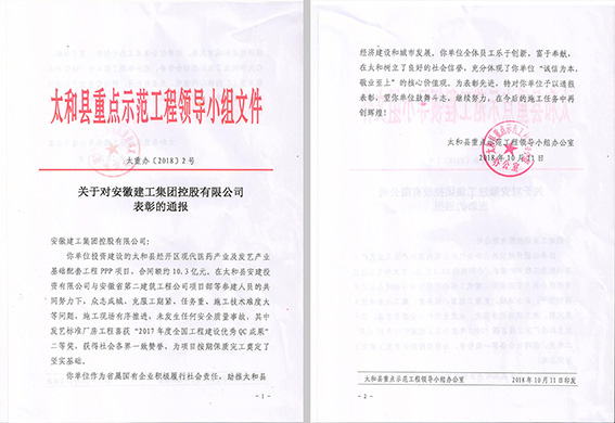 經(jīng)過(guò)兩年的“浴血奮戰(zhàn)”,2018年9月30日,太和PPP項(xiàng)目完成交工驗(yàn)收工作,項(xiàng)目建設(shè)圓滿收官,并受到太和縣人民政府及太和縣重點(diǎn)示范工程領(lǐng)導(dǎo)小組辦公室的一致表彰,為公司品牌宣傳,形象提升做出積極努力,為“打造一流安徽建工”添磚加瓦。