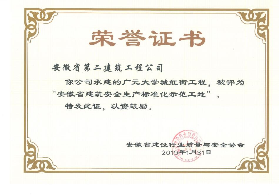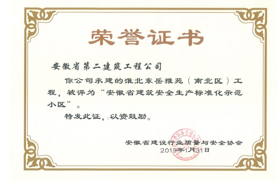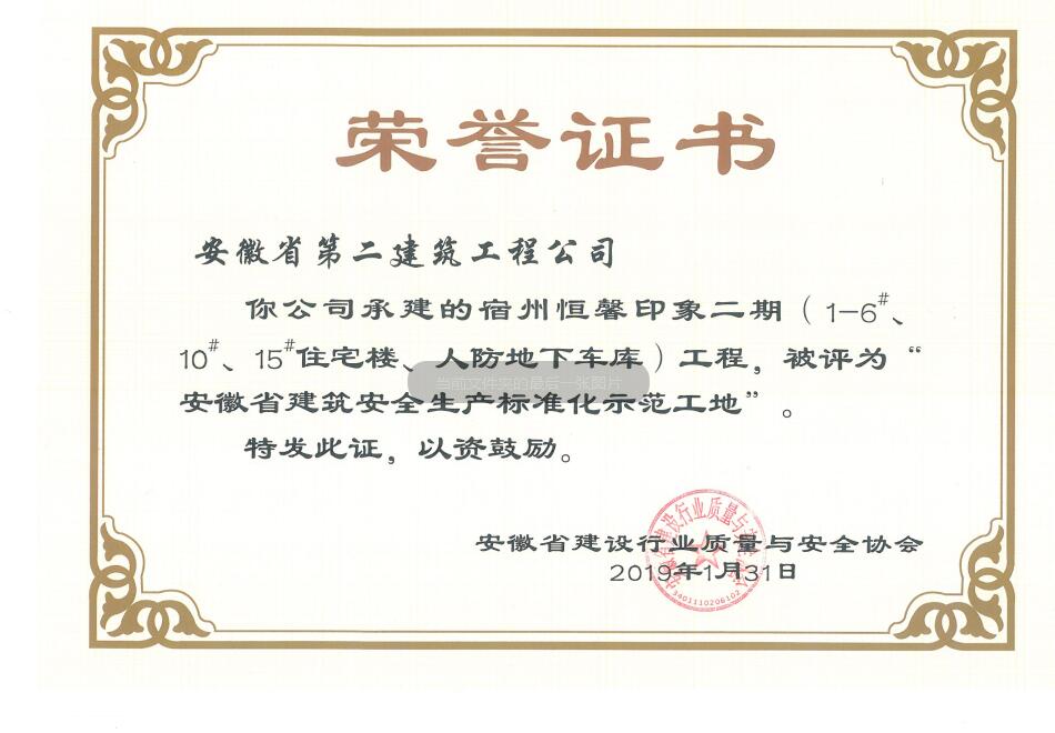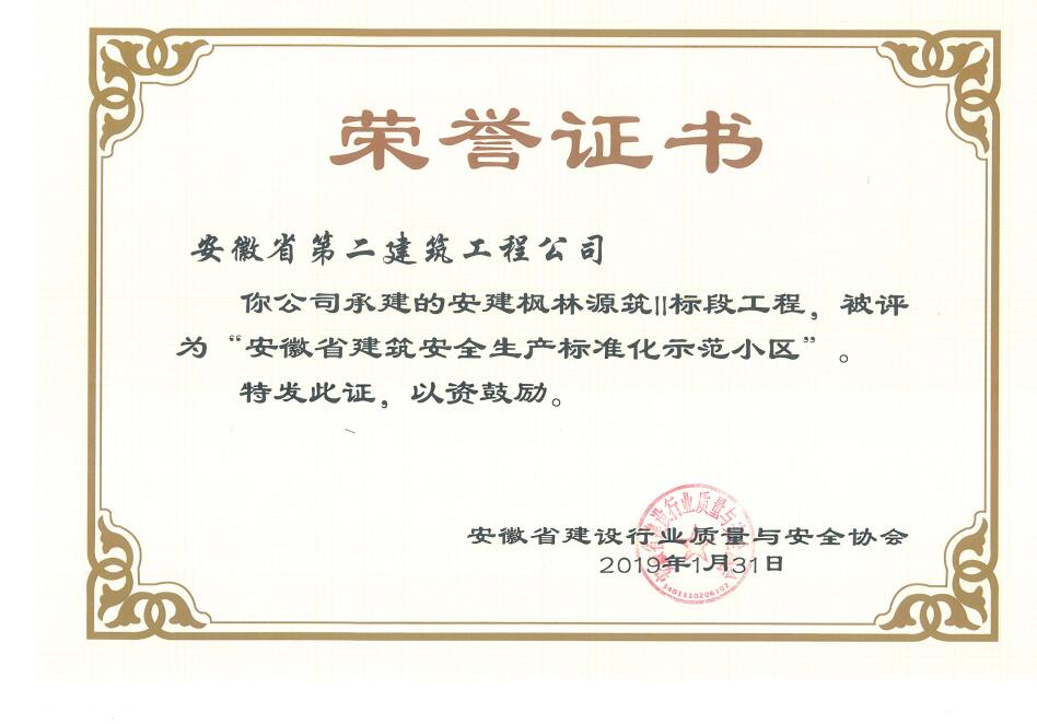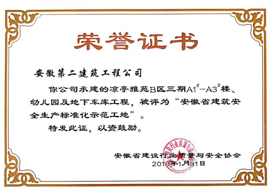 近日,從安徽省建設行業(yè)質量與安全協(xié)會獲悉,安徽二建承建的肥西涼亭雅苑、阜陽楓林源筑、阜陽廣元大學城、宿州恒馨印象、淮北東岳雅苑5個項目獲得2018年度“安徽省建筑施工安全生產標準化示范工地”稱號,為公司再添榮譽。