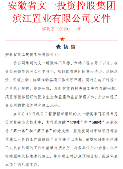 安徽二建文一·塘溪津門五標項目管理團隊堅持疫情防控與復工復產(chǎn)兩手抓、兩手硬,管理團隊齊心協(xié)力、盡職盡責、積極主動,保質(zhì)保量完成施工任務(wù)。在5月16日安徽省文一投資控股集團濱江置業(yè)有限公司工程管理部組織的五月份質(zhì)量安全大檢查中,“47#樓”取得第一名的好成績,獲建設(shè)單位通報表揚。