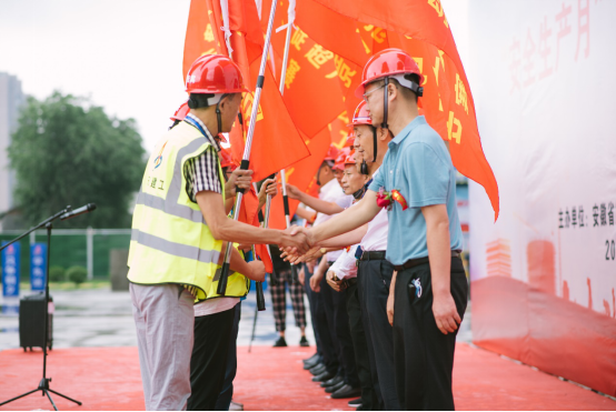 之后,公司工程管理部副主任丁光啟宣讀了2020年勞動競賽方案;總經(jīng)理助理、一分公司經(jīng)理崔書斌代表勞動競賽參賽單位進行了宣誓;參加啟動儀式的領(lǐng)導(dǎo)向參賽單位進行授旗。最后,陸勤斌宣布安徽二建公司“戰(zhàn)疫情、搶工期、保目標、促超產(chǎn)”勞動競賽正式開始。