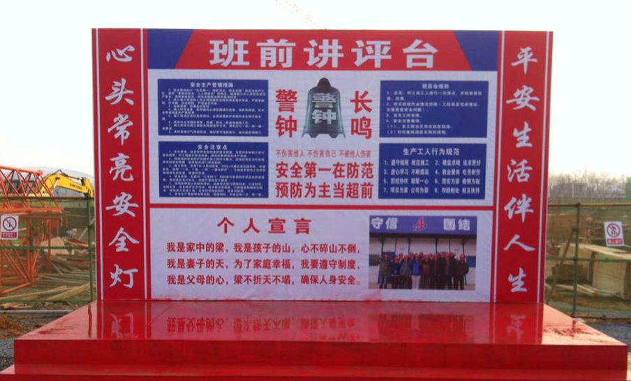 在項(xiàng)目施工現(xiàn)場(chǎng),坐落著一塊長(zhǎng)5米、寬2米的宣傳板,上方寫著“班前講評(píng)臺(tái)”,左右各寫“心頭常亮安全燈”“平安生活伴人生”的字樣。這是三分公司宿松安建龍溪山莊項(xiàng)目部工地開展的施工前安全教育活動(dòng)。