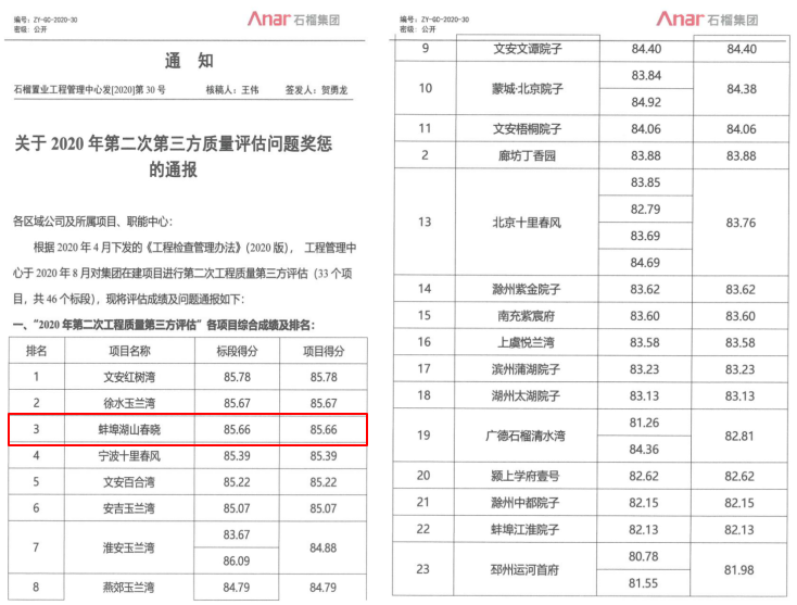 本次檢測(cè)涉及33個(gè)項(xiàng)目、46個(gè)標(biāo)段、39家施工單位,檢測(cè)方采用隨機(jī)抽取的辦法,按照統(tǒng)一標(biāo)準(zhǔn)、統(tǒng)一尺度進(jìn)行檢測(cè),檢測(cè)數(shù)據(jù)實(shí)時(shí)上傳,確保檢測(cè)結(jié)果公平公正,評(píng)估分為工程質(zhì)量實(shí)測(cè)實(shí)量、混凝土檢測(cè)、安全文明施工、質(zhì)量風(fēng)險(xiǎn)防控四個(gè)部分,檢測(cè)結(jié)果如實(shí)反映各工程的實(shí)際施工質(zhì)量水平。安徽二建公司承建的蚌埠湖山春曉項(xiàng)目在檢測(cè)中綜合得分85.66分,位列第三名,受到建設(shè)單位的通報(bào)表?yè)P(yáng)和獎(jiǎng)勵(lì),為公司贏得了社會(huì)信譽(yù),同時(shí)也為和石榴集團(tuán)下一步合作奠定了堅(jiān)實(shí)基礎(chǔ)。