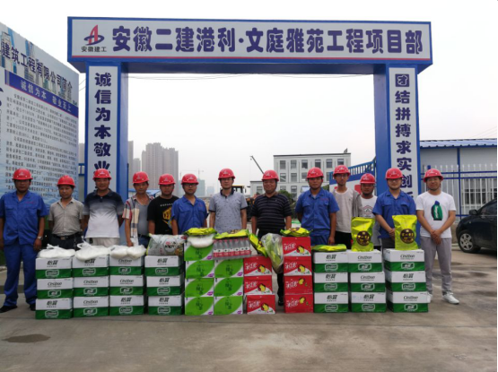 炎炎日正午,灼灼火俱燃,為做好一線工人防暑降溫工作,7月5日,四分公司支部書記董建民、生產(chǎn)副經(jīng)理馬勁松等代表分公司赴淮北港利文庭雅苑項目開展“送清涼”活動。