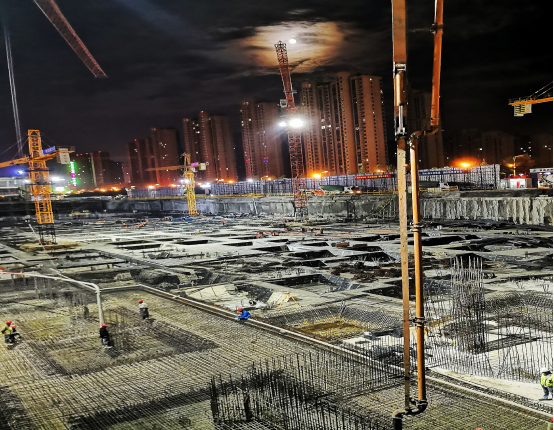 施工進(jìn)入白熱化階段,遇到材料短缺、勞務(wù)班組緊張等困難,分公司領(lǐng)導(dǎo)更高度重視,組建了由各個科室負(fù)責(zé)人參加的“重點(diǎn)項(xiàng)目工作協(xié)調(diào)QQ群”,把項(xiàng)目遇到的難題及時反饋并予以解決,分公司經(jīng)理馬福才、支部書記陳習(xí)武更是經(jīng)常駐扎現(xiàn)場,解決勞務(wù)外援、協(xié)調(diào)處理大宗主材進(jìn)場等問題。在每日召開的生產(chǎn)調(diào)度會上,項(xiàng)目經(jīng)理汪傳松多次強(qiáng)調(diào),要超前謀劃,科學(xué)組織,大膽管理,各勞務(wù)班組根據(jù)現(xiàn)有工作面盡快增加班組和一線作業(yè)工人,上足人員;項(xiàng)目部要合理配置人力、物力、塔吊等垂直運(yùn)輸設(shè)備,安排好工序銜接,實(shí)現(xiàn)晝夜不間斷施工,同時要確保“大干大安全、小干有安全”,針對業(yè)主6月20日提出正負(fù)零節(jié)點(diǎn)計(jì)劃,項(xiàng)目部制定了四點(diǎn)措施:一是分解目標(biāo),細(xì)化責(zé)任,日排計(jì)劃,要求現(xiàn)場施工人員根據(jù)圖紙認(rèn)真梳理計(jì)算各標(biāo)段工程量,詳細(xì)分解施工任務(wù);二是明確現(xiàn)場責(zé)任分工,加大管理力度,督促現(xiàn)場盯控力度,保障工程質(zhì)量;三是加大協(xié)調(diào)力度,優(yōu)化資源,整合機(jī)械設(shè)備發(fā)揮最大的生產(chǎn)力;四是加強(qiáng)與勞務(wù)班組負(fù)責(zé)人的溝通,明確節(jié)點(diǎn)任務(wù),輸貫信念,激發(fā)工人潛力,提高工作效率。全體人員要同心協(xié)力,充分發(fā)揮團(tuán)結(jié)奮進(jìn)精神,要見縫插針,穿插作業(yè),要有“搶晴天戰(zhàn)雨天,白天晚上加班干”的精神,強(qiáng)勢推進(jìn)施工進(jìn)度。從5月12日到5月25日已完成產(chǎn)值2300萬,創(chuàng)安徽二建公司月產(chǎn)值歷史新高;截至目前,鋼筋用量1700噸;混凝土用量11000方,平均每日混凝土澆筑量550方。
