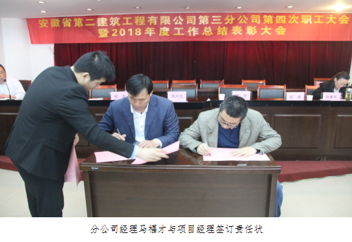 在分公司職工大會(huì)上,分公司經(jīng)理馬福才與參賽的各項(xiàng)目經(jīng)理簽訂了勞動(dòng)競(jìng)賽責(zé)任狀。其中阜陽(yáng)吾悅廣場(chǎng)項(xiàng)目為新城控股開發(fā),是分公司首次與上市地產(chǎn)公司合作,工期緊、任務(wù)重,項(xiàng)目經(jīng)理表示一定會(huì)不折不扣的完成勞動(dòng)競(jìng)賽責(zé)任狀的內(nèi)容,做到比、學(xué)、趕、幫、超,塑造二建良好形象。其他項(xiàng)目經(jīng)理也一致表示會(huì)認(rèn)真貫徹職代會(huì)精神,積極響應(yīng)勞動(dòng)競(jìng)賽號(hào)召,為完成公司年度指標(biāo)添磚加瓦,為黨的98歲華誕送上一份生日祝福。