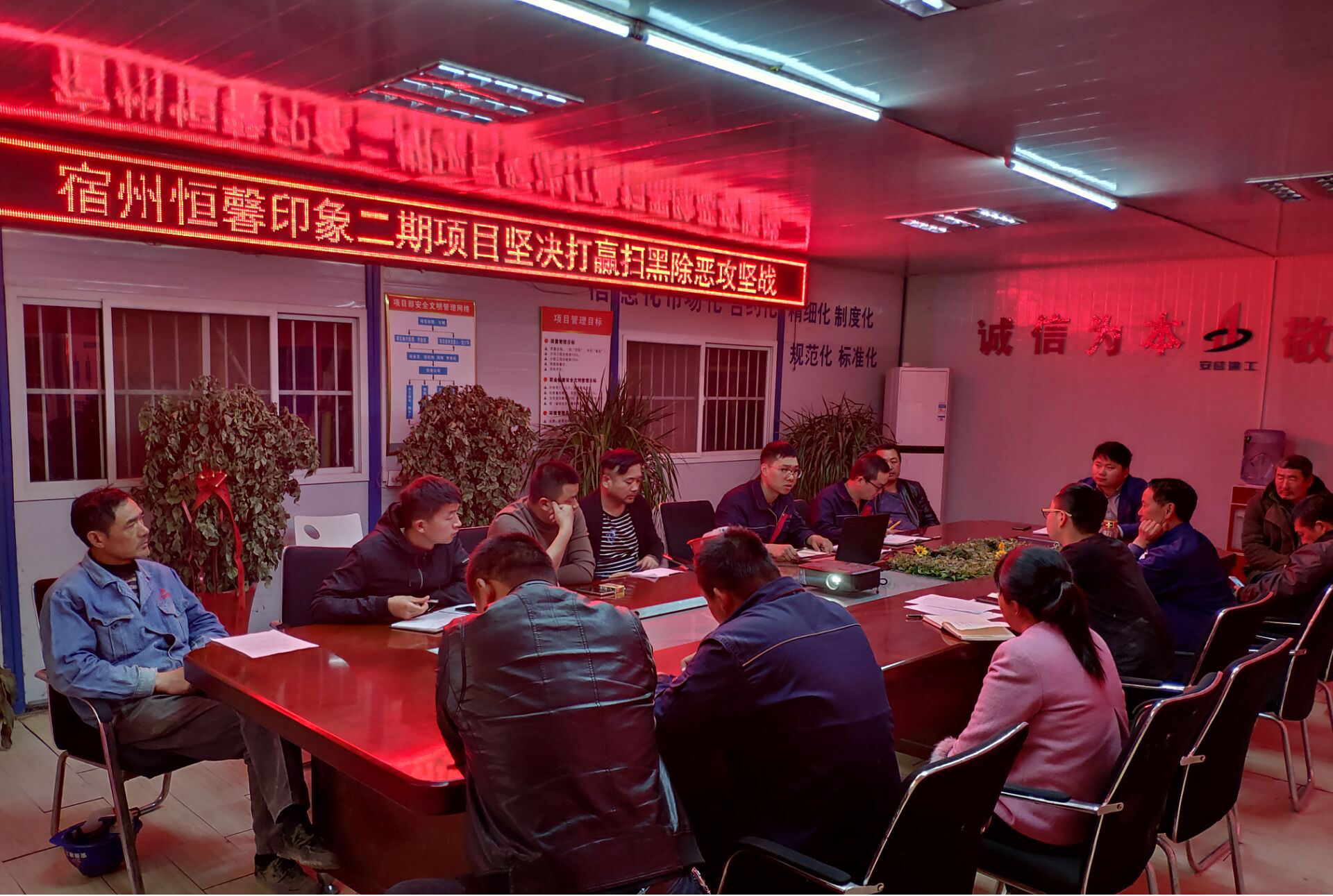 根據(jù)公司下發(fā)的關(guān)于掃黑除惡專項治理行動的通知要求,宿州恒馨印象二期項目于2019年4月15日下午利用生產(chǎn)調(diào)度會召開掃黑除惡專題會議,進(jìn)行了工作部署,成立了“掃黑除惡工作領(lǐng)導(dǎo)小組”。小組辦公室設(shè)在安全科,項目經(jīng)理任組長,技術(shù)負(fù)責(zé)人、生產(chǎn)經(jīng)理任副組長,各科室負(fù)責(zé)人為成員,切實形成掃黑除惡整體工作合力。項目部通過懸掛橫幅、led電子顯示屏、各樓棟張貼通告、微信群發(fā)等多種方式向施工現(xiàn)場人員宣傳掃黑除惡專項斗爭的參與方式和獎勵規(guī)定,有效提升了掃黑除惡效果,為正常的安全生產(chǎn)保駕護(hù)航。