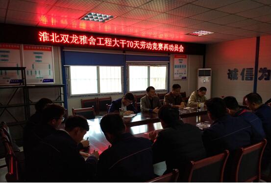 自十月初公司開(kāi)展“大干70天”勞動(dòng)競(jìng)賽活動(dòng)以來(lái),淮北雙龍雅舍項(xiàng)目在項(xiàng)目經(jīng)理盧因東的帶領(lǐng)下積極響應(yīng)公司號(hào)召,合理安排工作計(jì)劃,精心組織施工部署,全面掀起大干熱潮。會(huì)上,崔書(shū)斌經(jīng)理要求項(xiàng)目部繼續(xù)保持高昂的工作熱情,倒排施工計(jì)劃,抓住關(guān)鍵節(jié)點(diǎn)。蒯家江宣貫了公司勞動(dòng)競(jìng)賽活動(dòng)精神,指示項(xiàng)目部落實(shí) “比、學(xué)、趕、幫、超”活動(dòng)方式,提高認(rèn)識(shí),端正態(tài)度。強(qiáng)調(diào)年輕管理人員要加強(qiáng)自身學(xué)習(xí),提高工作執(zhí)行力,養(yǎng)成良好的工作習(xí)慣;同時(shí)也要有面對(duì)挫折的勇氣,做到干一行愛(ài)一行,同心協(xié)力為二建的發(fā)展貢獻(xiàn)一份力量。