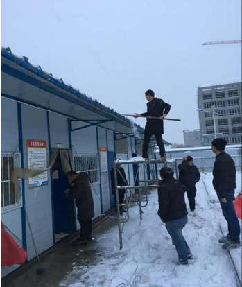 大伙兒冒著寒風(fēng),紛紛拿著鐵鍬、掃帚等打掃工具趕赴掃雪現(xiàn)場(chǎng),相互配合、齊心協(xié)力,你鏟我掃,一點(diǎn)點(diǎn)地將積雪鏟起集中堆放,一派熱火朝天的景象。經(jīng)過一個(gè)多小時(shí)的奮戰(zhàn),項(xiàng)目部施工現(xiàn)場(chǎng)主要通道和項(xiàng)目部院子、生活區(qū)等地的積雪全部鏟除,看著清理干凈的路面,大家洋溢著開心的笑容。