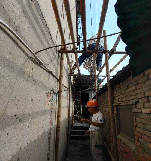 近日,公司后勤綜合服務(wù)部在對(duì)公司老舊房屋進(jìn)行日常巡查時(shí)發(fā)現(xiàn),原四分公司生活基地大禮堂山墻檐口出現(xiàn)間斷式沉降斷裂。經(jīng)檢查,此處的問題是由墻體自重及屋面木質(zhì)結(jié)構(gòu)自然腐朽所導(dǎo)致的。山墻腳即是住戶出入通道,隨時(shí)有墜落傷人的安全隱患。鑒于大禮堂層高十幾米,無法實(shí)施維修處理,我部第一時(shí)間向領(lǐng)導(dǎo)匯報(bào)后,及時(shí)拿出整頓方案,頂著烈日高溫,立即沿山墻搭建一條十幾米長的鋼管架安全通道,排除了隱患,確保居民出入平安。