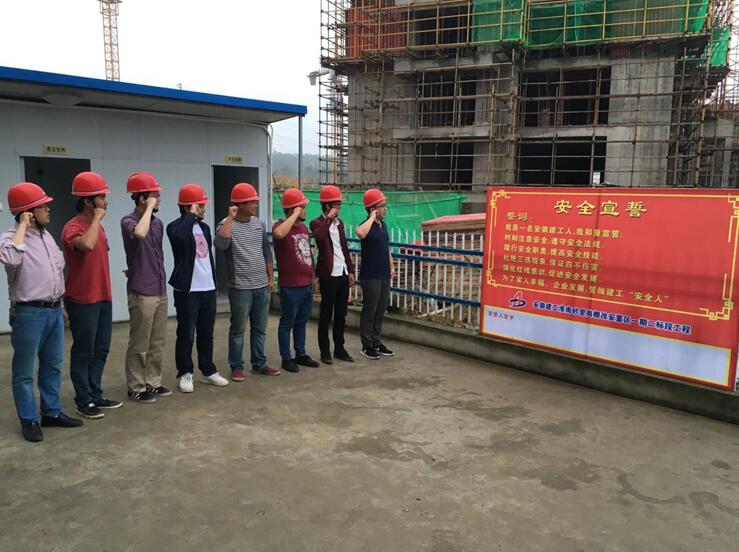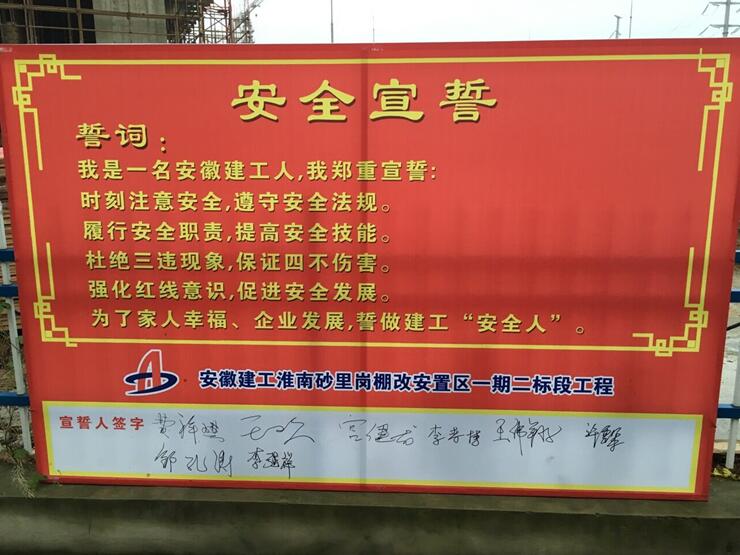 早上六點,清晨第一縷陽光剛剛灑下,項目部管理人員已在安全宣誓牌前排列整齊,面對莊嚴的宣誓牌,全體成員在項目技術(shù)負責人王歡的帶領(lǐng)下,右手握拳置于面龐,鄭重地齊聲宣讀誓詞:我是一名安徽建工人,我鄭重宣誓:時刻注意安全,遵守安全法規(guī);履行安全職責,提高安全技能;杜絕三違現(xiàn)象,保證四不傷害;強化紅線意識,促進安全發(fā)展;為了家人幸福,企業(yè)發(fā)展,誓做建工“安全人”。隨后,項目部全體成員在項目經(jīng)理費祥琪的帶領(lǐng)下,陸續(xù)在宣誓牌上簽下了自己的名字,表明自己時刻謹記安全宣誓內(nèi)容,堅持安全生產(chǎn)的決心。