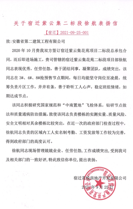 近日,第三分公司宿遷中南紫云集花苑項目的施工員徐航收到了一封業(yè)主單位發(fā)來的表揚信,平日大方灑脫的他在收到信后露出了靦腆的笑容,他表示:“這是自己的分內(nèi)工作,以后會繼續(xù)保持”。平日里的徐航工作責任心強,在項目3#、4#、8#搶收節(jié)點期間,兢兢業(yè)業(yè)堅守崗位,每日加班加點至凌晨,在他和所在片區(qū)工人的努力下,項目如期完成節(jié)點任務(wù)。針對項目現(xiàn)場工作總是親歷親為,在面對裝配式項目的施工難點、重點工作時,通過對專業(yè)書籍的學習,不斷攻堅克難,提高能力,增強技能。他負責的片區(qū)在質(zhì)量風險、勞務(wù)實名制等方面工作明顯優(yōu)于其他樓棟的工作,在業(yè)主方“飛檢”、政府檢查中得到高度認可。
