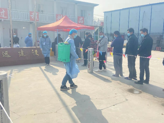 宿遷市進(jìn)入4月份以來疫情較為嚴(yán)重,自4月1日起,全市分區(qū)域進(jìn)行封控、管控,上級政府部門要求施工單位積極配合協(xié)助開展防疫工作。疫情就是命令,接到任務(wù)后,項(xiàng)目經(jīng)理劉闖立即召開防疫工作會議,全面落實(shí)各項(xiàng)疫情防控措施。設(shè)置單獨(dú)的隔離觀察室,用于需臨時(shí)隔離觀察的人員單獨(dú)生活居?。粶?zhǔn)備口罩、測溫計(jì)、消毒液等防疫物資;排查兩周內(nèi)往來史、接觸史,杜絕疫情的輸入性、擴(kuò)散性蔓延;對所有進(jìn)出施工區(qū)、辦公區(qū)、生活區(qū)人員進(jìn)行實(shí)名制登記和現(xiàn)場消毒殺菌;嚴(yán)格落實(shí)施工工地封閉管理,全面管控人員出入工地,無關(guān)人員不得進(jìn)入工地,項(xiàng)目部人員停止休假、探親和聚集活動。除此之外,3月26日起,政府在項(xiàng)目部設(shè)置了核酸檢測站點(diǎn),目前已連續(xù)進(jìn)行了19次核酸檢測,包括附近工地和居民,每天約一千人,工作量極大。項(xiàng)目部志愿者積極配合現(xiàn)場防疫工作,對每個(gè)進(jìn)入現(xiàn)場的人員進(jìn)行掃碼、登記、測量體溫,為打贏疫情防控阻擊戰(zhàn)貢獻(xiàn)國企力量。