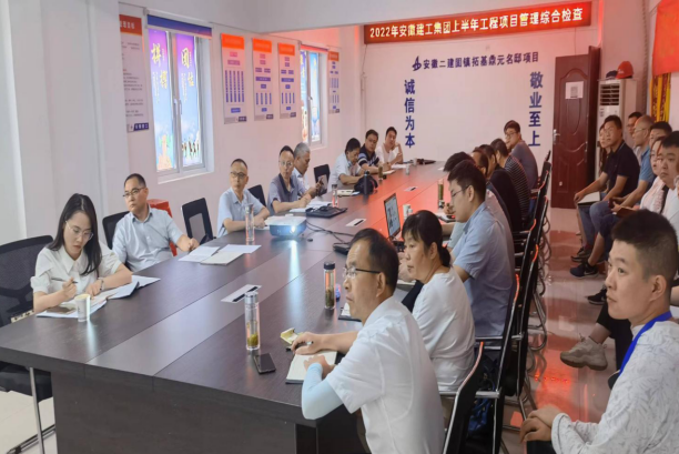為扎實推進“項目基礎(chǔ)管理年”活動,以檢查促落實、促整改、促提升,2022年6月28日,建工股份公司工程管理部(安全監(jiān)察局)督查員范毓慶一行8人赴安徽二建固鎮(zhèn)拓基鼎元名邸項目,開展上半年工程項目管理綜合檢查工作。安徽二建公司黨委委員、副總經(jīng)理葉和永,總經(jīng)理助理、第一分公司經(jīng)理崔書斌及公司相關(guān)職能部門負責人參加。