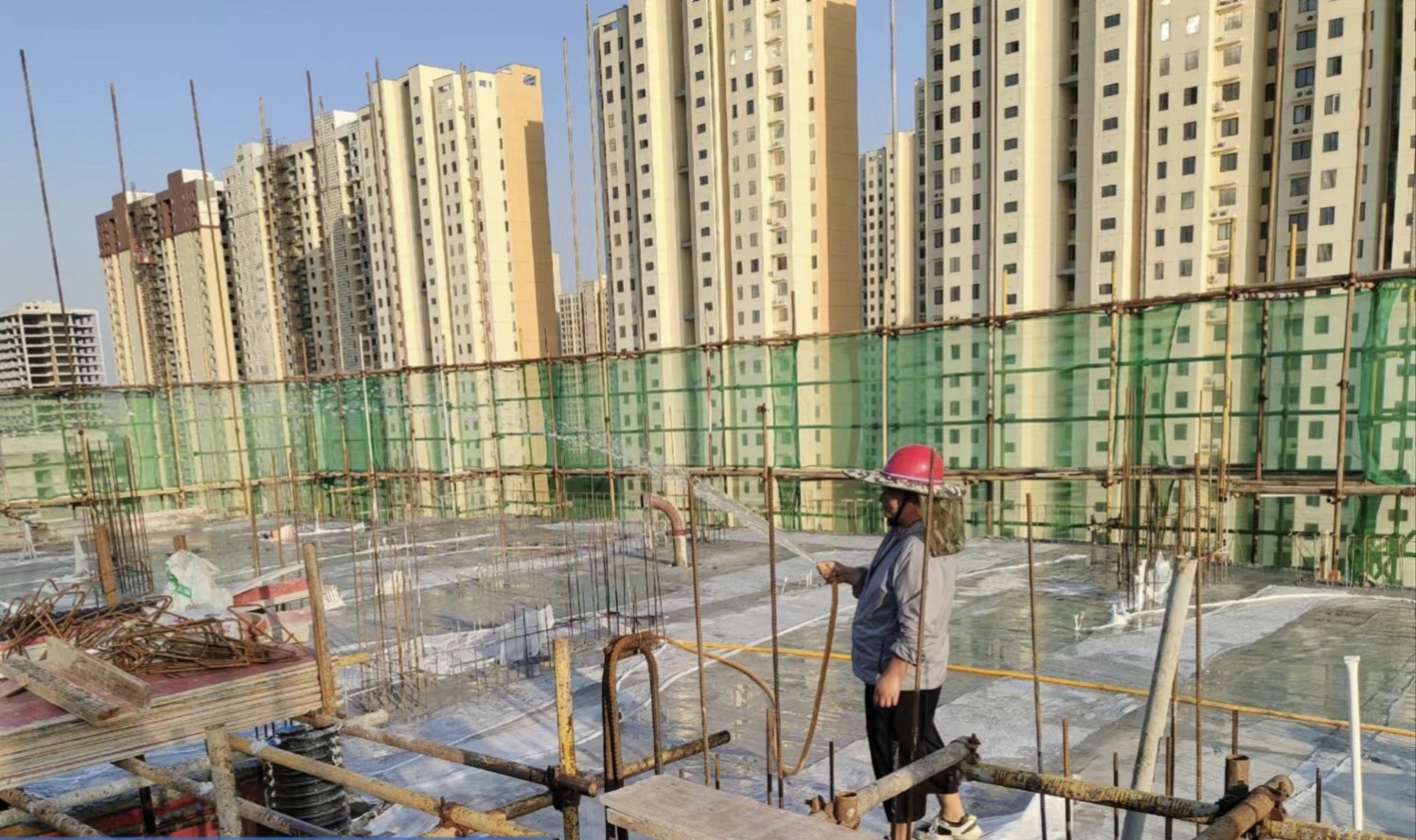 炙烤了一天的混凝土面撒水保養(yǎng)后蒸汽騰騰