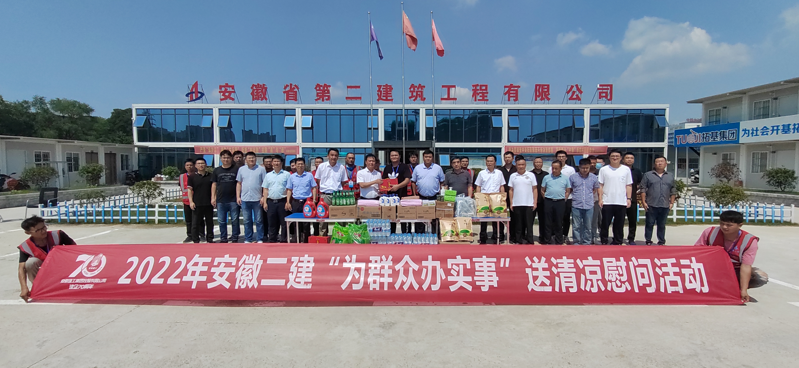 為做好高溫季節(jié)防暑降溫工作,切實維護職工安全健康權(quán)益,深入推進“我為群眾辦實事”活動,體現(xiàn)公司對項目部一線廣大職工的關(guān)心、關(guān)愛,7月13日起,安徽二建公司領(lǐng)導(dǎo)班子成員陸續(xù)帶隊深入項目一線,開展“送清涼”活動,發(fā)放防暑降溫物品,看望、慰問奮戰(zhàn)在生產(chǎn)一線的項目職工。